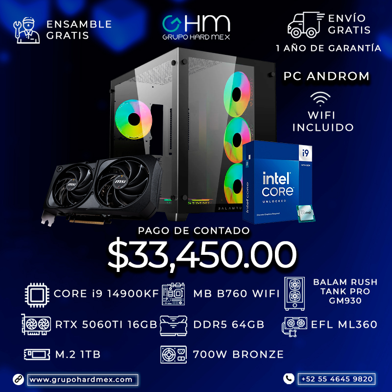PC ANDROM - I9 14900KF B760 WIFI 64GB RAM DDR5 RTX 5060Ti 16GB PSU 700W BRONZE EF LIQUIDO ML360